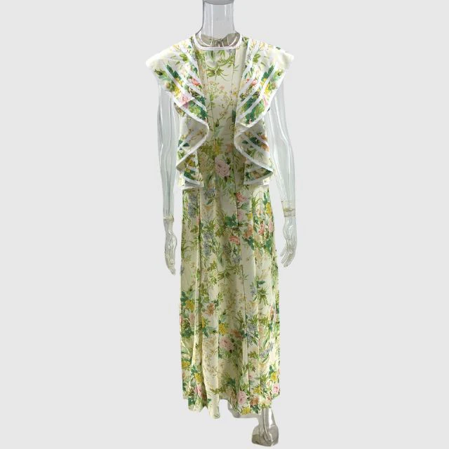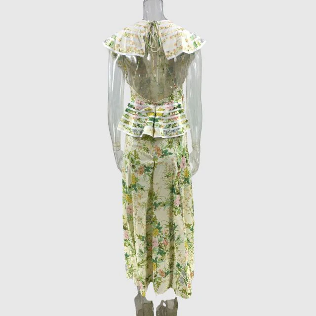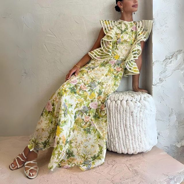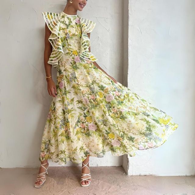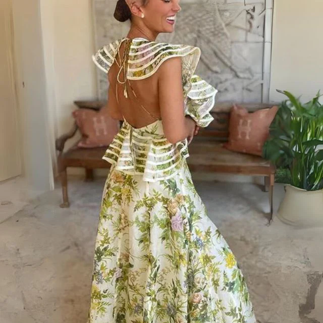 De Viviana – A-lijn jurk met bloemenprint en ruche accenten straalt charme uit met haar flirterige backless design en speelse bandjes. De print, een weelderige tuin vol bloemen, vloeit samen met het swingende silhouet van de jurk en creëert een betoverende visie van vrouwelijkheid en verleiding.