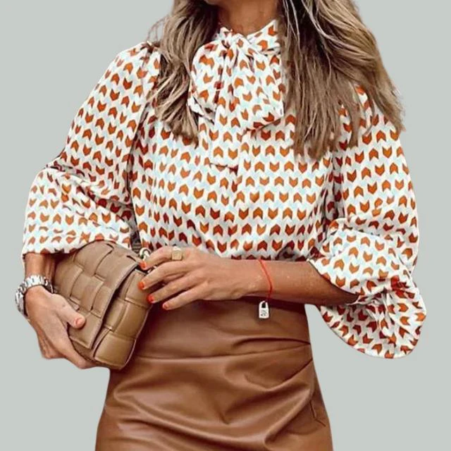 Stap zelfverzekerd de lente of herfst in met deze Geneva – houndstooth print blouse met hoge kraag. De aantrekkelijke print van de blouse is zowel geraffineerd als speels en creëert een casual maar geraffineerde look. In combinatie met een strakke rok van imitatieleer belichaamt het moeiteloze elegantie en is het een must-have voor de dame met een flair voor eigentijdse, ontspannen mode.