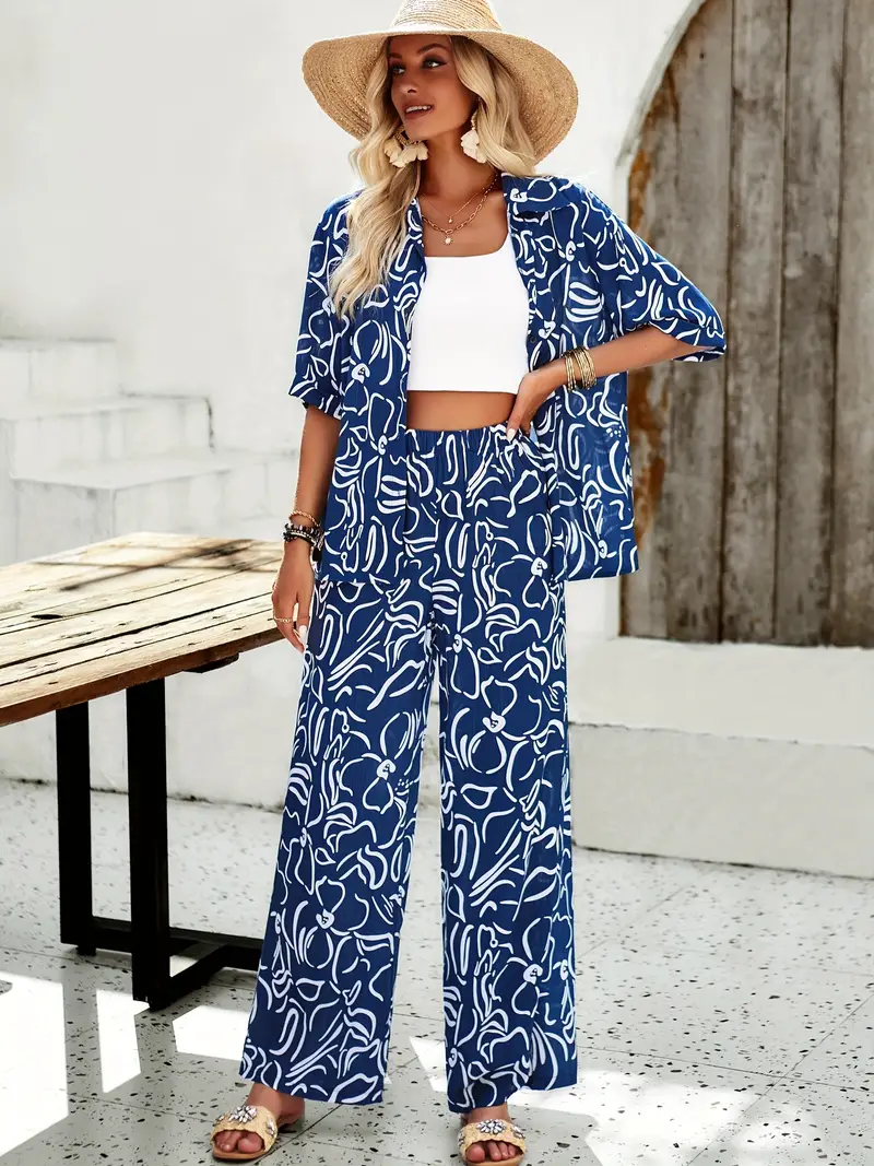 Ontdek onze chique tweedelige set met een opvallende all-over print. Deze set bestaat uit een overhemd met korte mouwen en een broek met knoopsluiting, gemaakt van lichtgewicht viscose voor comfortabel dragen.